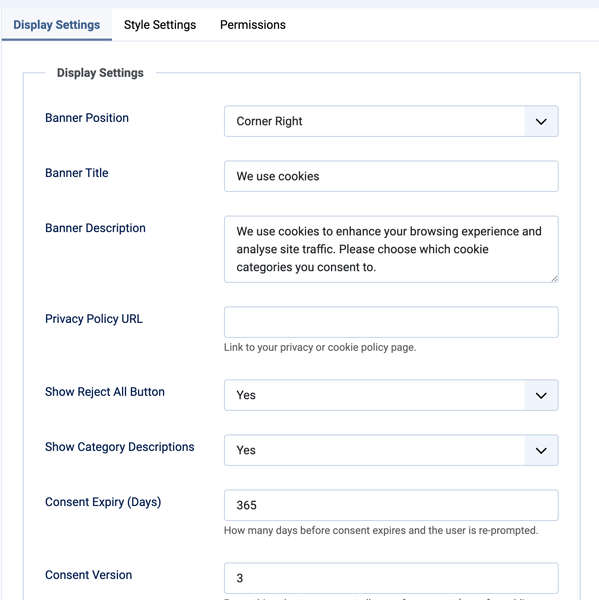 - Consent Version — increment this number to re-prompt all visitors. Useful when your cookie policy changes.
