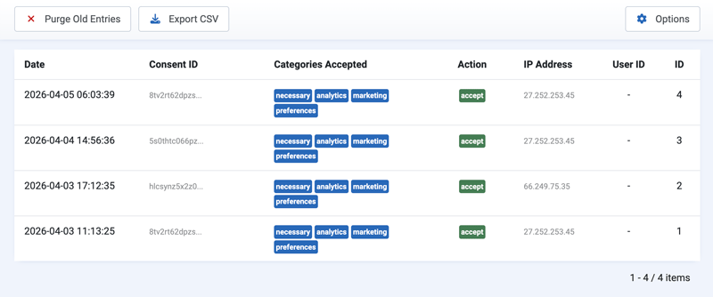 Every time a visitor accepts, rejects, or modifies their consent, the decision is logged server-side.