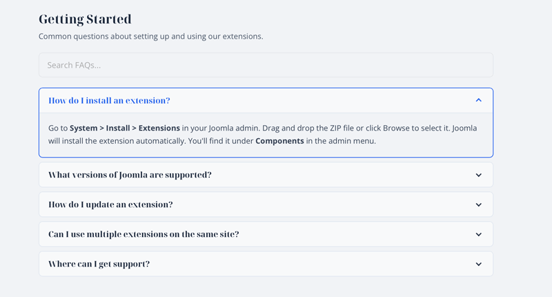 FAQLab is a focused FAQ component that creates organised, searchable FAQ pages with accessible accordions and nested categories. It replaces the frustration of ugly, inflexible FAQ extensions with a clean tool that looks good out of the box and includes Google FAQ schema markup for SEO.