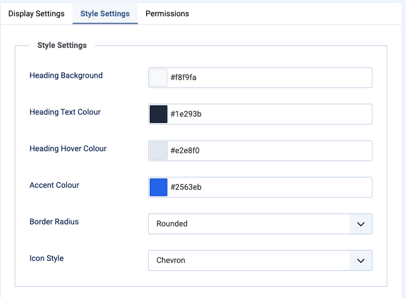 - Icon Style — Chevron (default), Plus/Minus, or None.