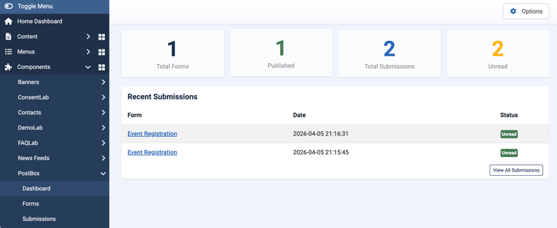 All form submissions are stored in the admin panel at Components > PostBox > Submissions.