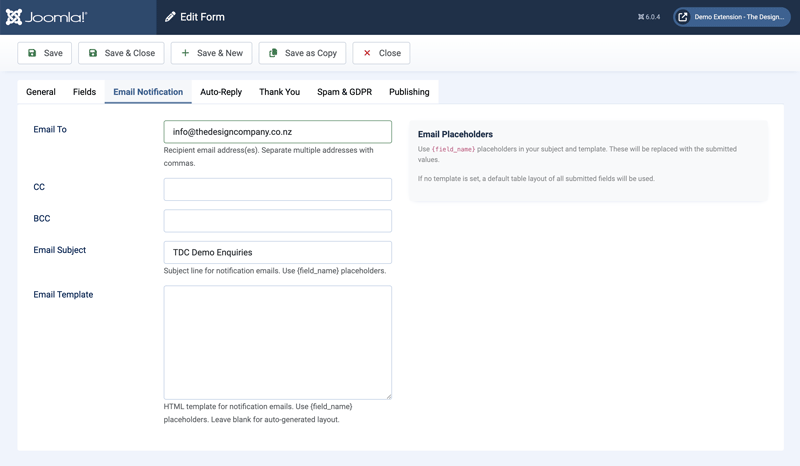 - On the Email Notification tab, enter the recipient email address. Leave blank to use the Joomla system email.