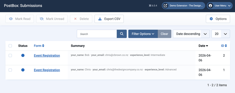 - Use the toolbar to mark read, mark unread, delete, or export as CSV.