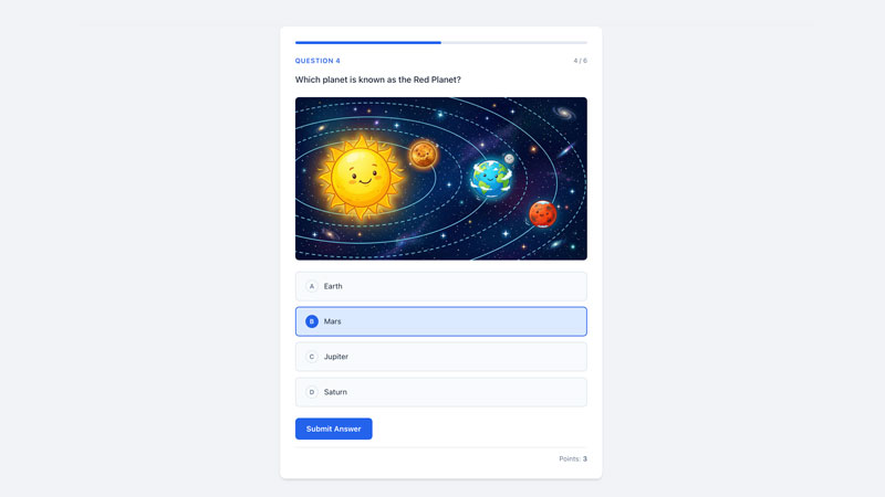 The most common question type. Add 2 to 8 answer options and mark one as correct. Options can include text and optional images. Students click an option to select it, then submit.