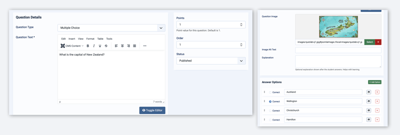 question_type—multiple_choice,true_false, ornumericpoints— Point value for the questionexplanation— Explanation shown after answeringnumeric_answer— Correct numeric value (alternative to using thecorrectcolumn)numeric_tolerance— Acceptable margin of error for numeric questionsquestion_image— Path to a question imagequestion_image_alt— Alt text for the question image