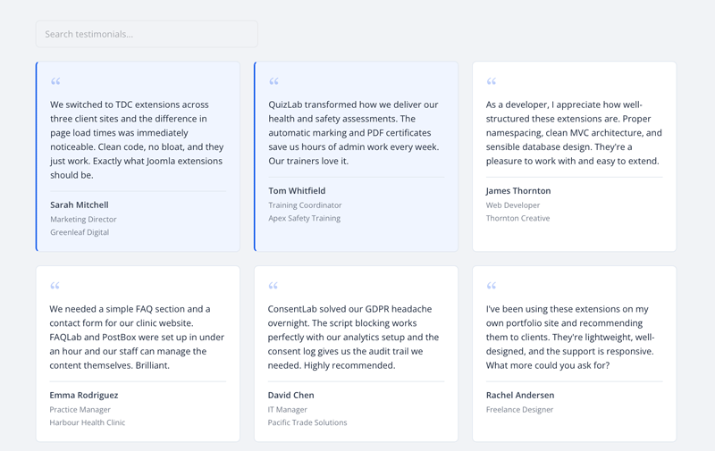 TestimonialLab is a focused testimonials component that displays client quotes in clean, responsive layouts. It replaces the frustration of heavyweight testimonial plugins with a simple tool that looks good out of the box and includes a module and shortcode embedding for flexible placement.