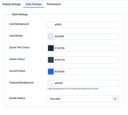 Configure the visual appearance in Components > TestimonialLab > Options > Style Settings: