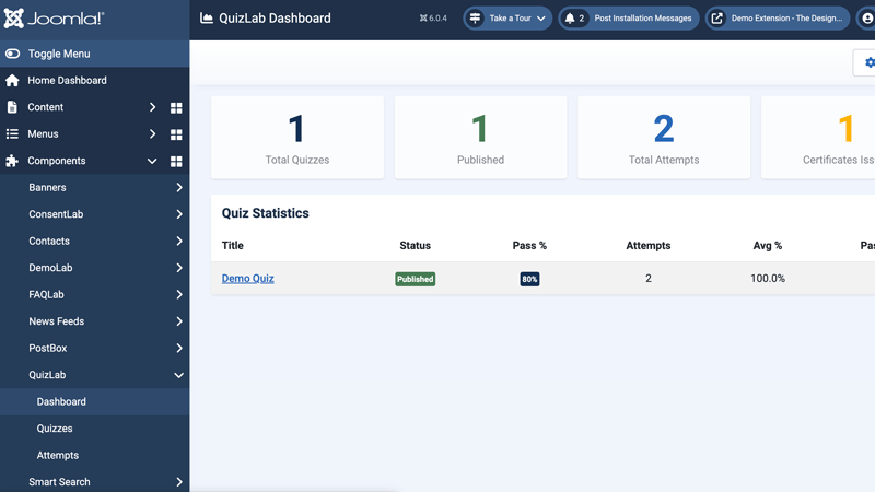 com_quizlab-*.zippackage and click Upload & Install. - QuizLab appears in the administrator sidebar under Components > QuizLab.
